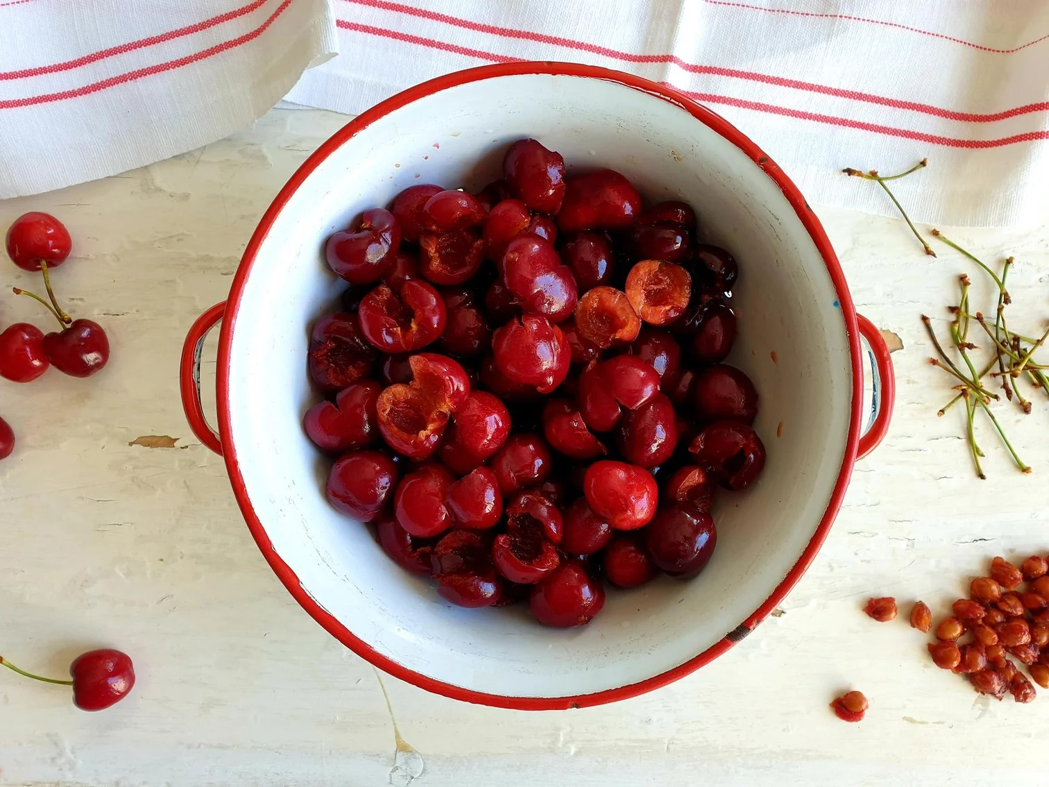 Wash the cherries, dry them a bit, take the stalks off and pit them. Place them in a colander and leave them to drain until needed.