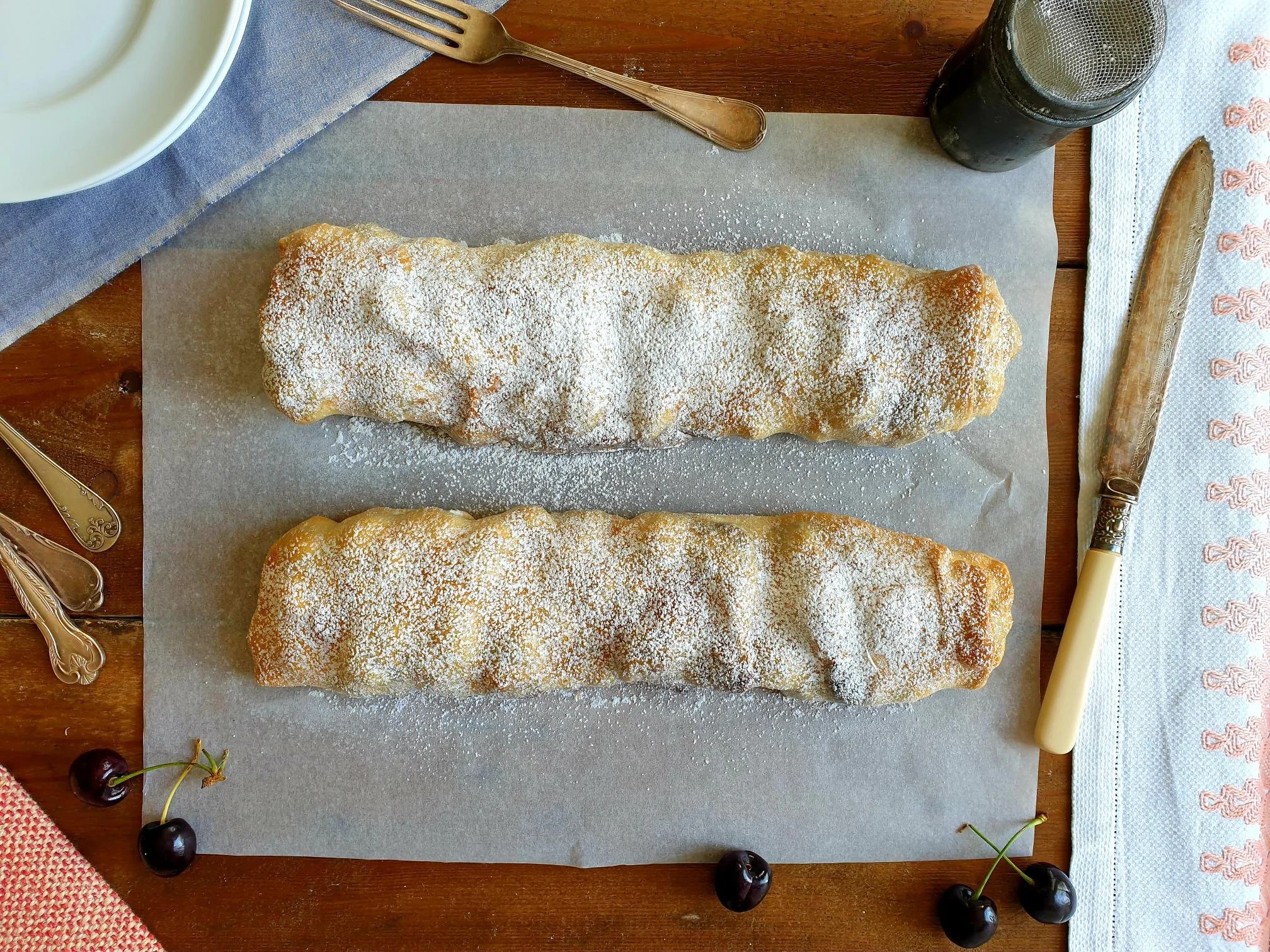 Apple strudel has been a big hit in all the countries that were once ruled by Austro-Hungarian Empire, but it is in the North Adriatic that this new variation was created giving originality to a very unique and less known type of strudel. A cherry strudel, is a very much loved seasonal dessert in Slovenian Istra, (Češnjev štrudelj or Češnjev zavitek) where I come from, and neighbouring Trieste in Italy.