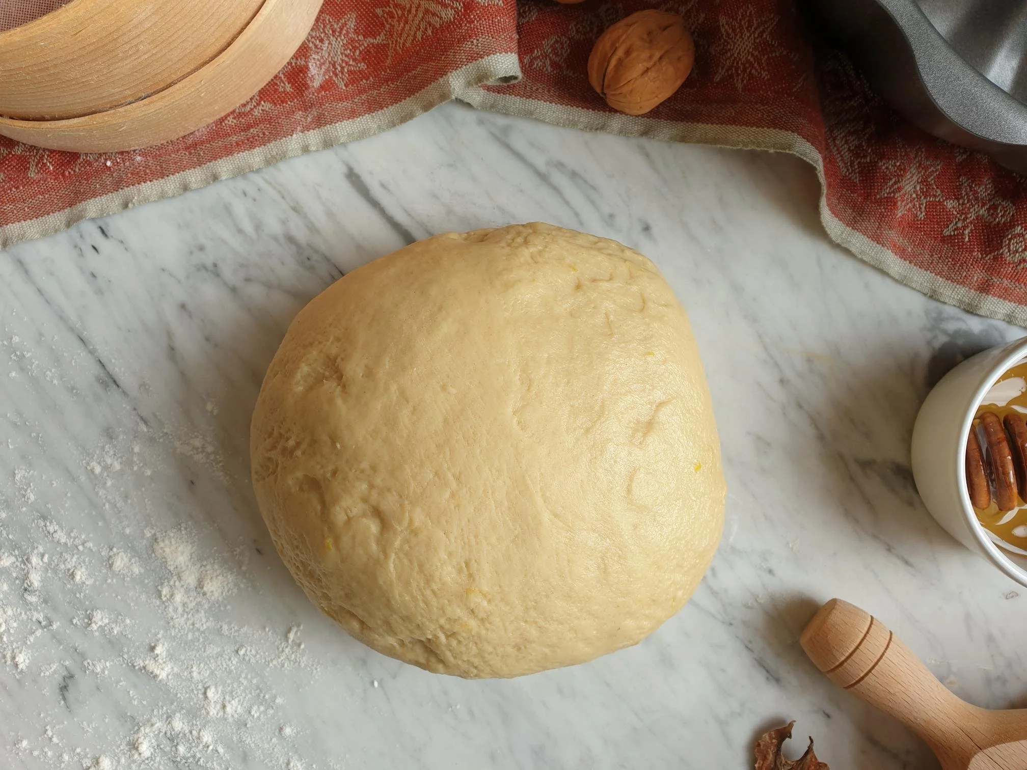 In a fairly large bowl, sift the flour, make a little well in the centre and add instant yeast, melted butter, caster sugar, lightly beaten egg yolks, grated lemon zest, dark rum and a pinch of sea salt. Mix and combine well all the ingredients.