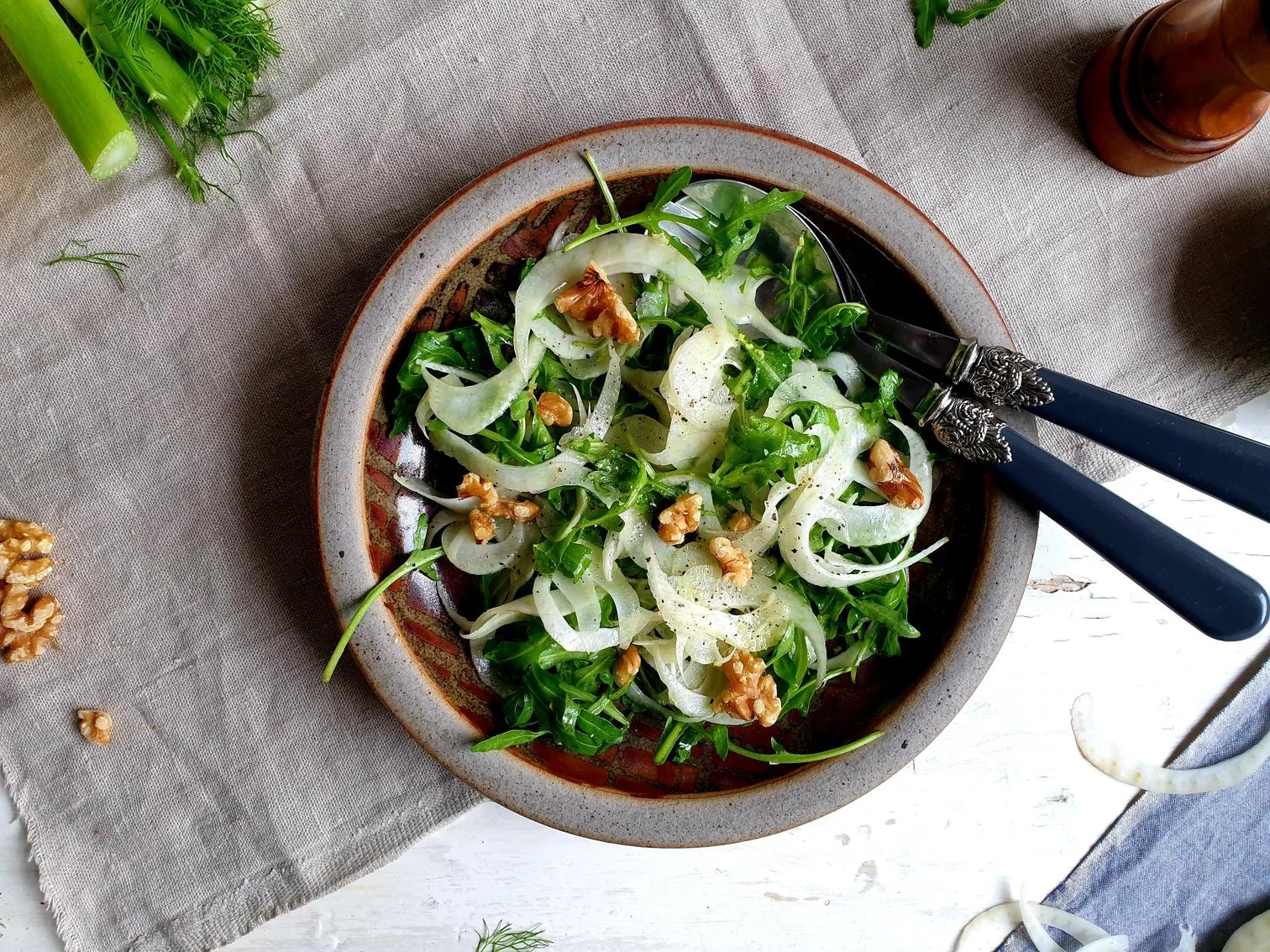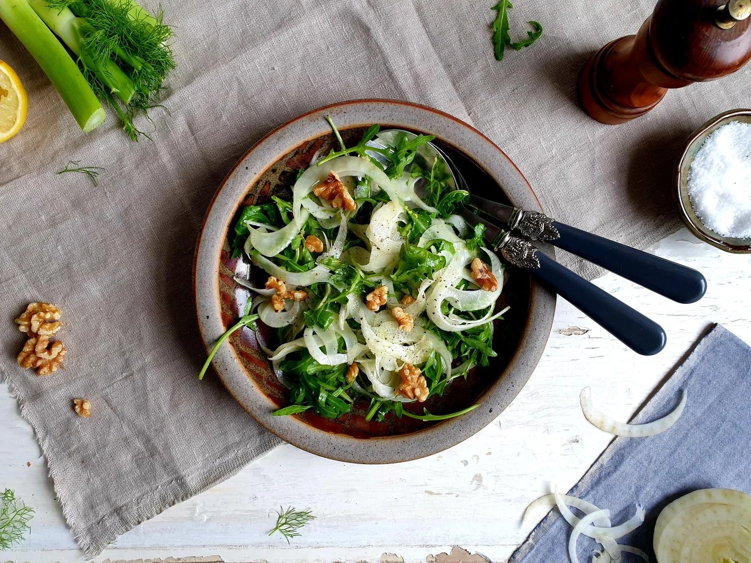 I am sharing here this traditional and unpretentious shaved fennel and rocket leaves salad recipe that will bring freshness to your dinner table, and for extra flavour and a bit of crunchy texture you can top this salad with walnut kernels or lightly toasted pine nuts.