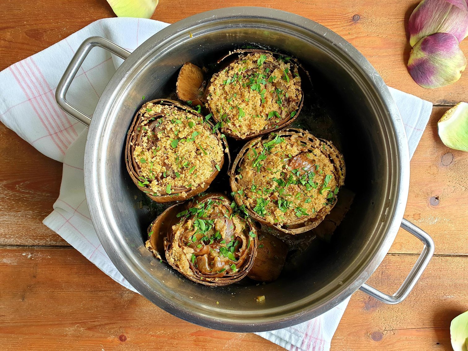 This dish is rustic and informal, artichokes are trimmed and stuffed with garlicky breadcrumbs, then cooked in a saucepan until tender.